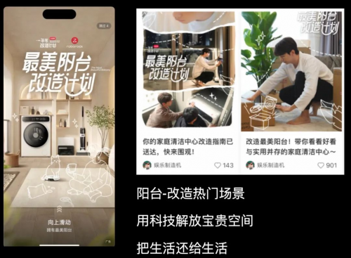 寻找匹配生活需求的具体场景、将场景营销打透,小红书联合石头扫地机发起「最美阳台改造计划」,将产品卖点结合到改造阳台的具体场景中,传递「用科技解放空间」的场景心智。