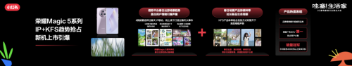 把新产品上市的脉冲式Campaign做得更科学更长效,小红书为荣耀Magic5系列定制「IPFS」打法,助推新机上市引爆。小红书携手品牌将新机上市Campaign联动到「我就要这样过春天」IP,在线上线下打造过春天大事件,实现场景攻占、趋势引领、人群触达;同时结合KFS种草组合投放方式,打造好内容、并配合信息流/搜索侧的投放动作,拉长新品生命周期。小红书助力荣耀Magic5系列新品上市即爆,抢占搜索广告SOV第一。