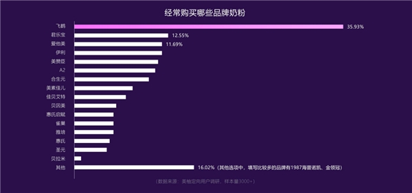 以奶粉为例,妈妈们会重点考虑是否易吸收、易消化,配方全面、营养更丰富及品牌信誉等。据美柚的一项定向问卷调研显示,在妈妈们常购买奶粉品牌中,飞鹤以35.93%的占比位列第一;纯羊奶粉品牌中,佳贝艾特最受青睐。