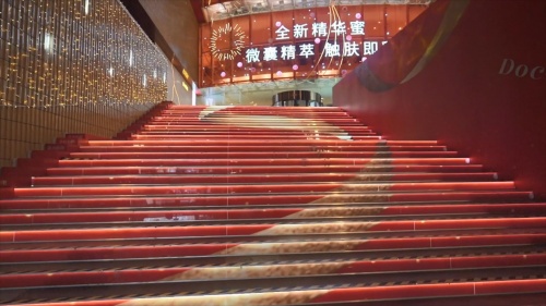 在整个灯画的主色调上,夜空彩虹选了大面积的红色作为背景色,以突出前景中的全新精华蜜产品以及精华蜜元素。配合动态的灯光控制,呈现出产品中水漾精华的清透感,以及精华的密集丰盈感。
