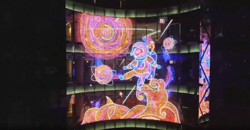 事实上,此次两座商业综合体的艺术灯画是由四川九墨文化创意有限公司策划设计,夜空彩虹落地执行。